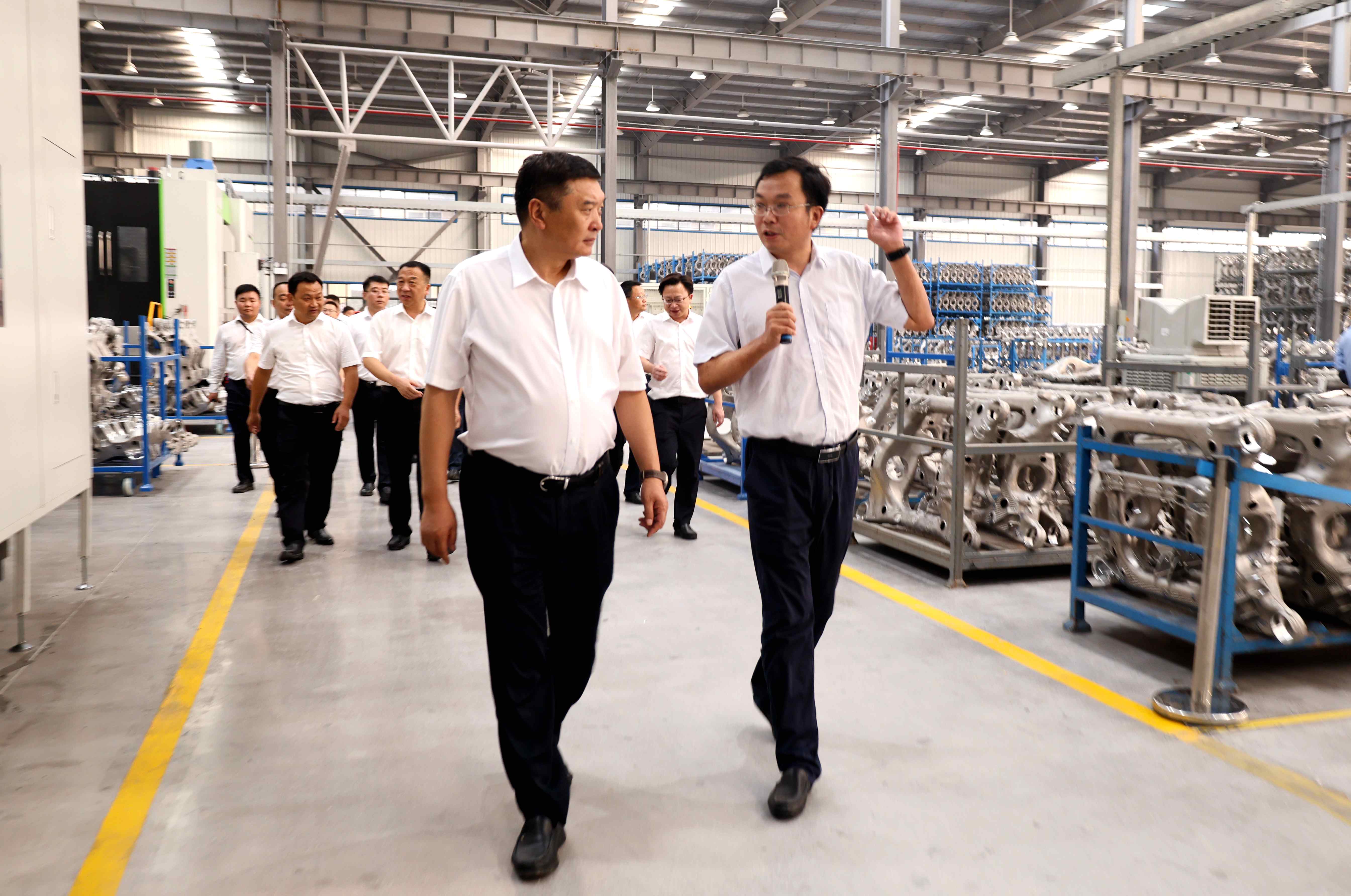 區政府包聯航特裝備單位負責人--掇刀區發改局局長王鵬程就航特新能源汽車輕量化副車架精密加工項目總體情況、產能規劃等內容作了詳細的說明。在精密加工車間內,公司副總經理熊小平向周俊杰及參加活動的各級領導介紹了項目建設情況、設備運行情況及當前市場形勢。周俊杰回顧了該項目從立項到實施建設的全部過程。